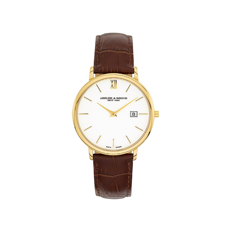 Material: Edelstahl, gelb Marke: Abeler Söhne Glasart: Saphirglas Ziffernblattfarbe: Hell Schliesse: Dornschließe Produktfamilie: Quarz Bandart: Leder Wasserdichte: 30 Meter Werkart: Quartz Ziffernblattart: Strich Ziffernblattzeichen: Index Artikelnr: 148776