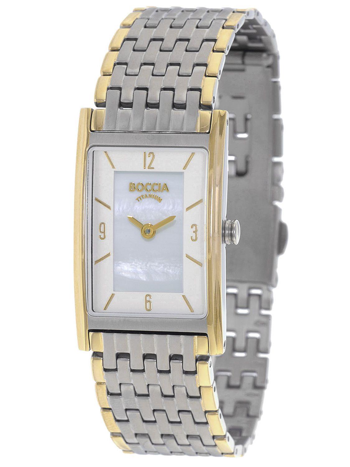 Material: Titan Marke: Boccia Glasart: Mineralglas Ziffernblattfarbe: Perlmutt Schliesse: Faltschließe Bandart: Gliederband Wasserdichte: 50 Meter Werkart: Quartz Ziffernblattart: Strich Ziffernblattzeichen: Index Artikelnr: 126116
