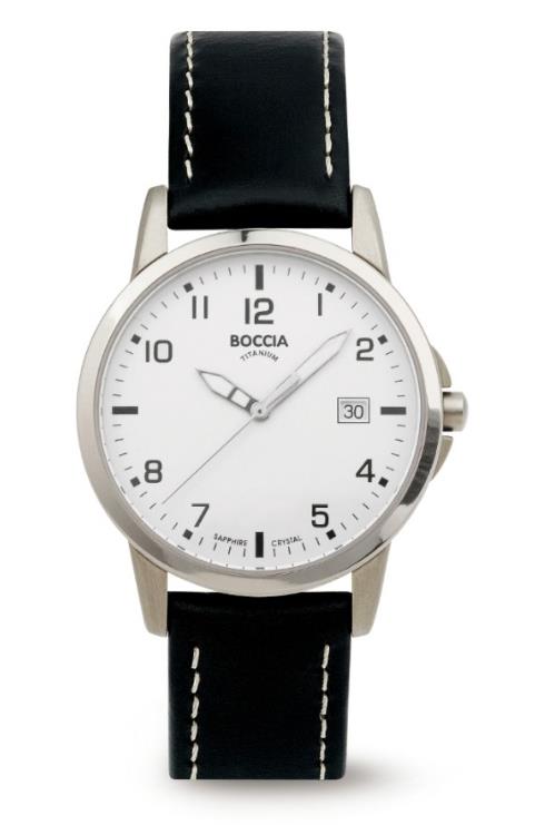 Marke: Boccia Glasart: Saphirglas Ziffernblattfarbe: Weiss Schliesse: Dornschließe Bandart: Leder Wasserdichte: 50 Meter Werkart: Quartz Ziffernblattart: arabisch Ziffernblattzeichen: Index Artikelnr: 136957