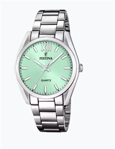 Marke: Festina Glasart: Mineralglas Ziffernblattfarbe: Grün Schliesse: Faltschließe Bandart: Gliederband Wasserdichte: 50 Meter Werkart: Quartz Ziffernblattart: Strich Ziffernblattzeichen: Index Artikelnr: 149398