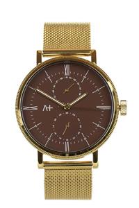 Material: Edelstahl, gelb Marke: Across Glasart: Mineralglas Ziffernblattfarbe: Braun Schliesse: Klappverschluss Bandart: Milanaiseband Wasserdichte: 30 Meter Werkart: Quartz Ziffernblattart: Strich Ziffernblattzeichen: Index Artikelnr: 146313 -