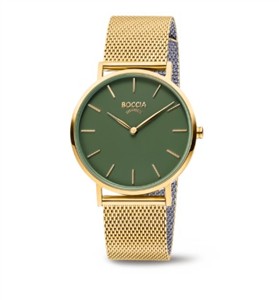 Material: Edelstahl, gelb Marke: Boccia Glasart: Mineralglas Ziffernblattfarbe: Grün Schliesse: Klappverschluss Bandart: Milanaiseband Wasserdichte: 30 Meter Werkart: Quartz Ziffernblattart: Strich Ziffernblattzeichen: Index Artikelnr: 149247