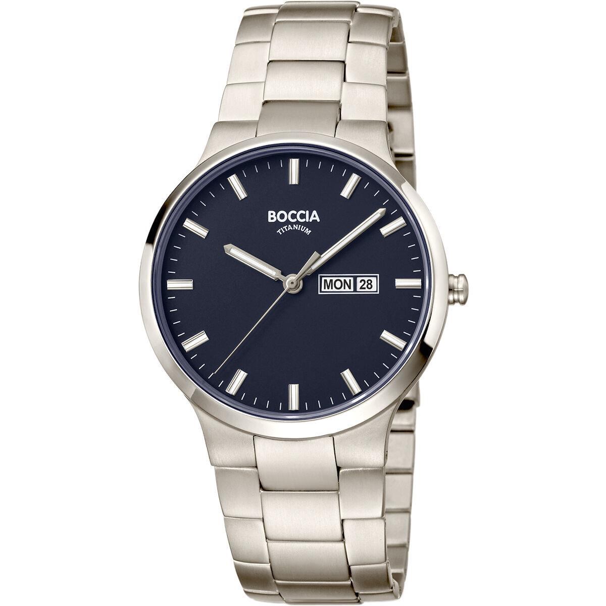 Marke: Boccia Glasart: Saphirglas Ziffernblattfarbe: Blau Schliesse: Faltschließe Bandart: Gliederband Wasserdichte: 50 Meter Werkart: Quartz Ziffernblattart: Strich Ziffernblattzeichen: Index Artikelnr: 140442